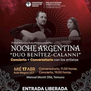 "Noche Argentina" en el Aula Magna UCT: Dúo Benítez-Calanni en concierto gratuito